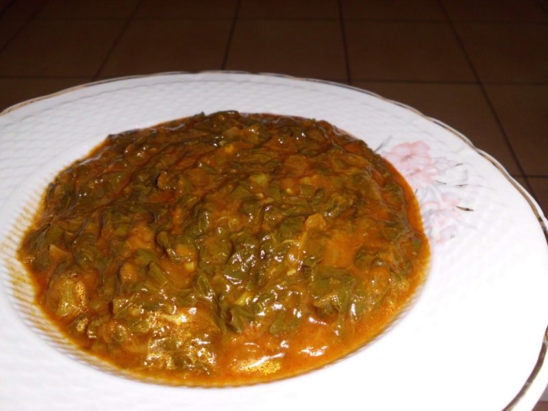 Spalam bine stevia si o taiem potrivit ca sa o simtim in mancare. Calim ceapa tocata marunt, adaugam si usturoiul si apoi morcovul ras fin. Adaugam cozile verzi de la ceapa si usturoi si adaugam supa. Dupa cateva minute adaugam stevia si mai adaugam daca este nevoie de supa. Spre sfarsit punem condimentele si bulionul desfacut. Inchidem focul si punem zeama de lamaie. Lasam sa scada si daca vreti dam si la cuptor pentru 10 minute. Este o mancarica pe care o ador si o fac foarte des si cu orice fel de carmne.