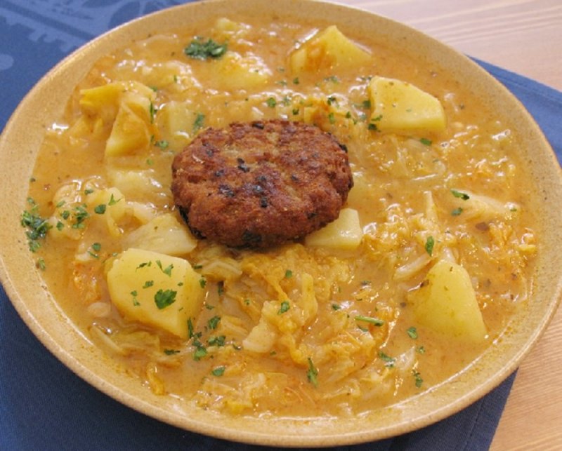 Adaugam apa pina trece de varza si cartofi si condimentam cu sare, piper si marar verde tocat.