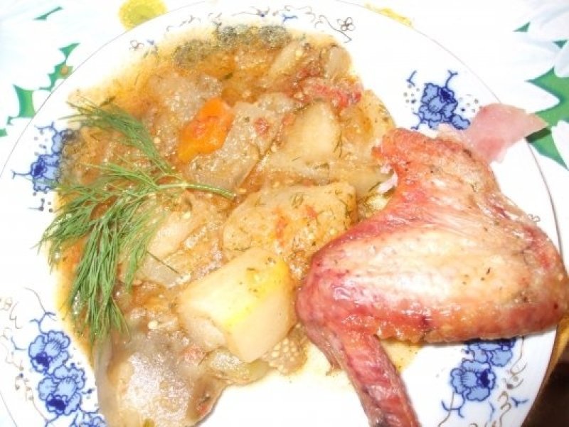Se spala legumele. Ceapa se curata, se taie julien si se pune la calit in uleiul incins. Cand devine sticloasa se pune putina apa si se continua fierberea. Se adauga morcovul taiat rondele. Vinetele se curata de coaja in dungi (eu am folosit de aceasta data vinete albe si galbene), apoi se taie in cuburi. Dovleceii se curata de coaja, se scobesc de seminte si taie si ei tot in cuburi.Dupa ce morcovul este aproape fiert se adauga ardeiul taiat mai mare, apoi vinetele, dovleceii si usturoiul. Se pune 1 cana de apa si se lasa sa fiarba acoperit. Se potriveste de sare, se pune piperul si rosiile decojite si tocate marunt. Cand mancarea este bine scazuta este gata. Se adauga mararul sau patrunjelul si serveste calda alaturi de friptura de pui, chiftelute sau carnati.