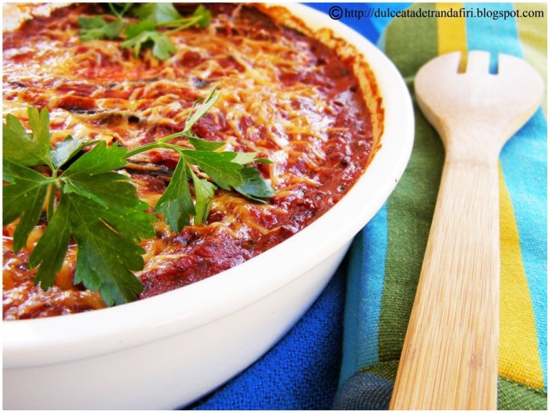 Cascavalul si mozzarella le tai felii putin mai grosute decat pentru un sandwich. Intr-o tava de sufleu (ceramica sau yena) pui alternativ, o felie de vanata, una de cascaval, una de vanata, una de mozzarella. La final torni pe deasupra tot sosul si cu o lingura il asezi prin toate "cotloanele" vasului. Presari parmezanul ras si bagi la cuptorul preincalzit la 175 de grade, 40-45 de min. Pofta buna!