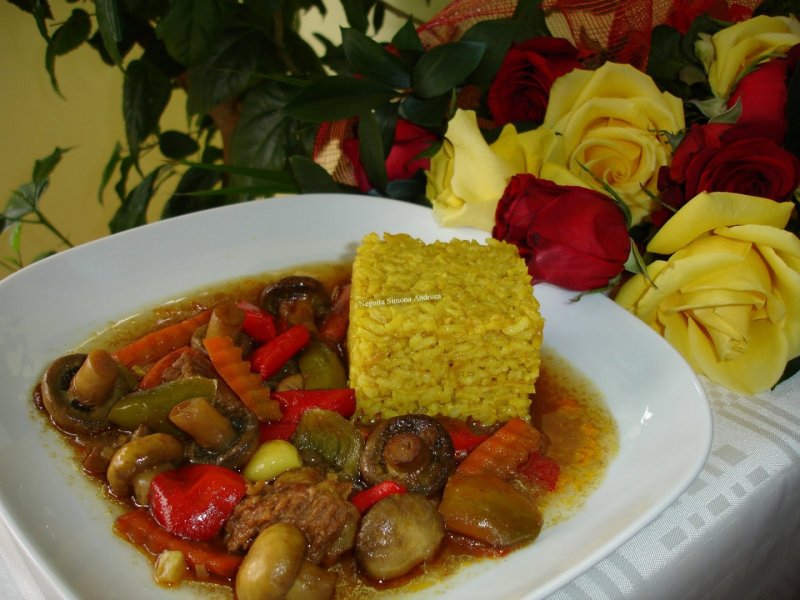 Ceapa alba o tocam marunt, ceapa rosie si ardeii cuburi mari iar morcovii cu forma pentru legume. Taiem carnea bucati mai mici si spalam ciupercile fara a le curata de coaja. Calim cepele si usturoiul in putin ulei de masline, adaugam la calit si ardeii, apoi morcovii si la final carnea. Dup ace au fost bine calite putem adauga si ciupercutele intregi. Stingem cu apa fiarta si dam la cuptor. Intre timp calim orezul, ii adaugam niste curry si sos de soia si punem supa de pui ( 1 parte orez si 2 parti si ½ supa). Lasam orezul pana absoarbe zeama. Adaugam condimentele la mancare, cate putin din fiecare si lasam pana fierbe carnea. Servim cu patrunjel verde si garnitura de orez.