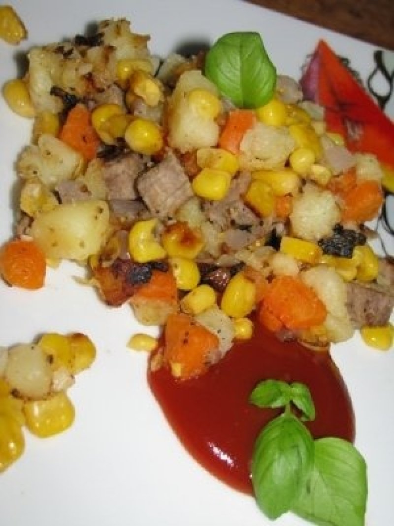 4. Se mareste flacara, se adauga 1 lingura ulei ramas, apoi se adauga cartofii, morcovii, boabele de porumb.Se asezoneaza dupa gust si se prajesc, amestecand din cand in cand, aprox. 10 minute pana cand incep sa formeze o crusta la baza.