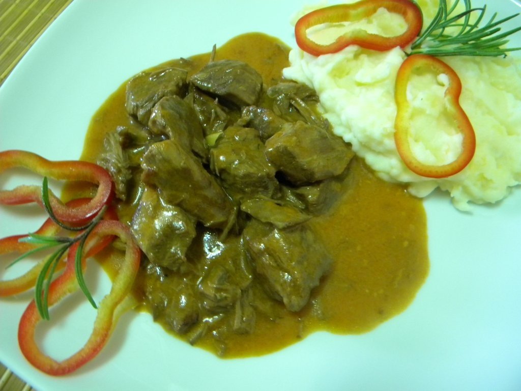 Se taie carnea cubulete,apoi se pun intr-o cratita in care am pus uleiul si untul.Se lasa cat sa se rumeneasca putin sa prinda o crusta,apoi se adauga supa de carne sau apa cat sa le acopere.Se fierbe la foc mic pana este aproape gata,apoi se adauga vinul,zaharul si sucul de rosii si se mai lasa sa fiarba pana ce carnea este facuta bine.Se condimenteaza cu sare si piper,apoi se adauga smantana pentru gatit,sosul soia si usturoiul tocat marunt,se lasa sa dea cateva clocote apoi se adauga faina de orez (sau amidonul) dizolvata in putina apa rece.Se lasa 3-5 minute pana ce sosul s-a ingrosat.Se serveste alaturi de piure,cartofi natur sau orez,impreuna cu o salata dupa gustul fiecaruia.