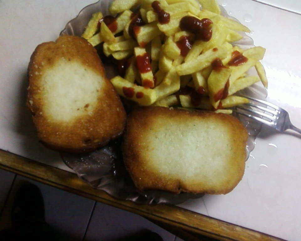 Prajesti cartofii in uleiul incins si feliile de paine pe ambele parti dupa ce s-au prajit cartofii. Stropesti ketchup peste cartofi si mananci rapid. Poti servi cu salata sau muraturi.