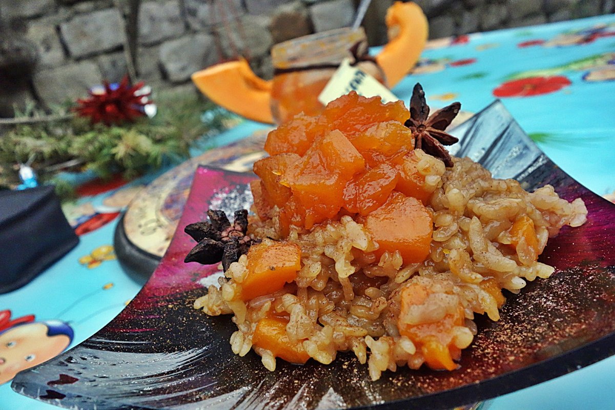 Se taie miezul de pe coaja dovleacului in cubulete mici. Orezul spalat se acopera cu apa rece si se lasa o ora sa se inmoaie un pic.