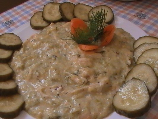In timpul acesta pui pieptul de pui la fiert cu putina vegeta. Cand este fiert se scoate din apa si se desface in fasii mici pe care le adaugi peste dovlecei. Pui mararul tocat si smantana. Condimentezi dupa gust.
