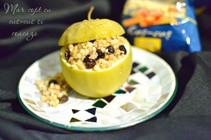Se incalzeste cuptorul la 180 g C. Se fierbe cus-cus-ul timp de 8 minute apoi se strecoara. Se macina alunele si migdalele apoi se amesteca cu zaharul brun, coacazele, untul, scortisoara si cus-cus-ul.