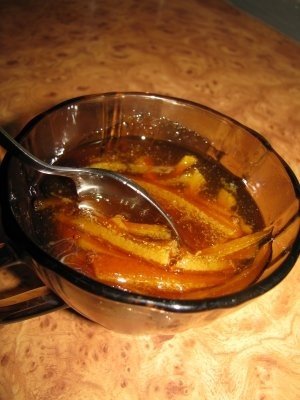 3. Toarna lichidul inapoi in cratita.Taie coaja de portocala in fasii subtiri, cu un cutit ascutit.Adauga fasiile de coaja in lichidul din cratita, adaugand si zaharul cald.Amesteca-le pe foc mic, pana ce zaharul s-a dizolvat, aprox.10 minute, dupa care lasa-le sa fiarba timp de 1h 30 minute - 2h, pana ce se leaga.