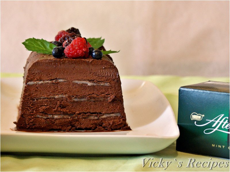 -Se așează un alt strat de cremă de ciocolată urmat de un strat de ciocolată After Eight, și se continuă până se montează trei straturi de ciocolată cu mentă, iar ultimul strat trebuie să fie de cremă de ciocolată.