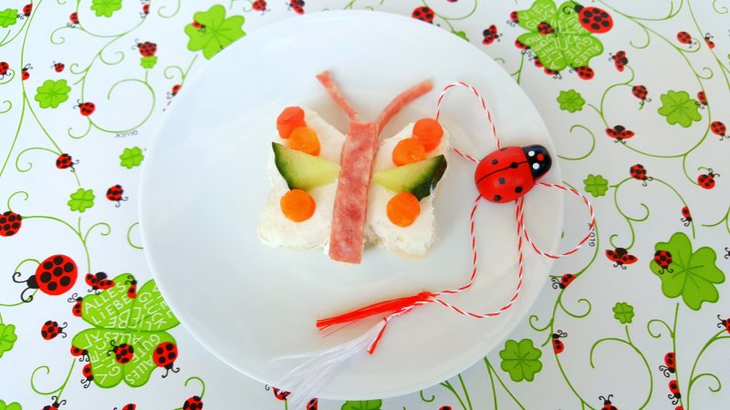 Se decupeaza painea in forma de fluturas, cu ajutorul unei forme pentru fursecuri. Se unge cu branza, apoi se asaza pe mijloc o fasie de salam, iar pe aripioare, se asaza cate un triunghi decupat din castravete, cate doua rondele de morcov decupate cu ajutorul unei duze pentru decorat si cate o rondea de rosie, taiata tot cu ajutorul unei duze pentru decorat. Din restul de salam, se decupeaza antenele si se fixeaza sub fasiuta de salam.