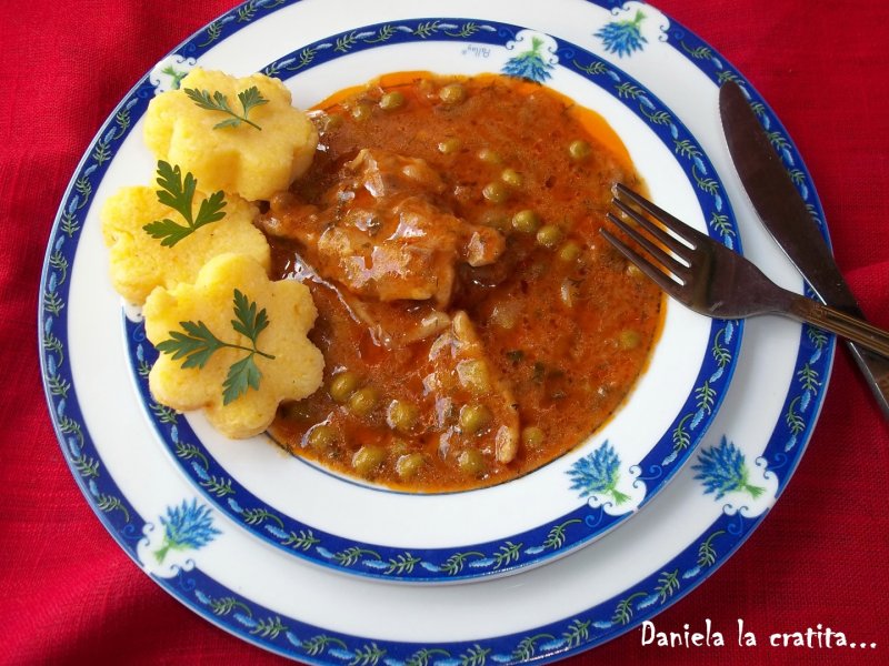 La final punem conserva de rosii cuburi,mazarea spalata si scursa bine si pasta de tomate desfacuta in cateva linguri de zeama.
