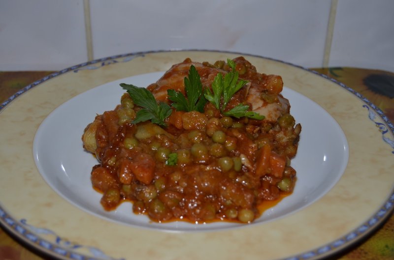 -Se curata ceapa ,se toaca si se undeste pana devine translucida,se adauga telina tocata marunt,morcovul tocat marunut si ardeiul si se undeste pana se patrund bine legumele,adaugam puiul portionat,mazarea,ierburi aromate ,sare dupa gust,o canita mica de apa (100 ml),punem capac si fierbem totul la foc mic.Cand carnea este fiarta adaugam rosiile cuburi,amestecam usor si lasam sa fiarba cateva minute,apoi oprim focul .Sa aveti pofta dragilor!
