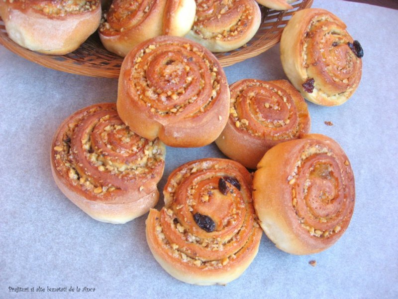 Cand aluatul si-a dublat volumul initial, infainam masa de lucru si taiem aluatul in doua partie egale. Cu sucitorul intindem prima parte de aluat intr-o foaie destul de subtire (cam 0.3 mm), o ungem cu untura/unt frecat cu zahar presaram deasupra jumate din cantitatea de nuca si punem deasupra stafidele sau ghimbirul taiat . Rulam aluatut , iar cu un cutit bine ascutit taiem din rulada bucati groase cam de 1 cm . Asezam bucatile in tava ca si cum ar fi niste melci .