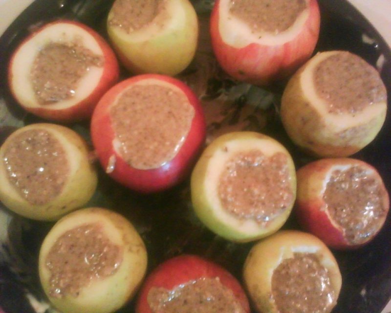 Spalam merele si le scobim in mijloc, batem albusurile spuma cu zahar apoi adaugam nucile si scortisoara, cu aceasta compozitie umplem merele. Se dau la cuptor 35 minute.