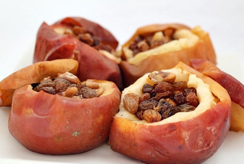 Merele se spala, se taie partea de sus si se scoate casa semintelor cu o lingurita. Acest loc se umple cu amestecul de stafide.