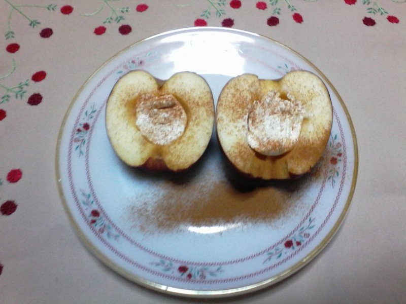 Spalam bine merele. Se taie pe jumatate si se scot samburi cu o lingura sau aparat special. Amestecam crema de branza cu coniac si portocale confiate cu aceasta compozitie umplem jumatatile de mere. Pudram cu scortisoara.