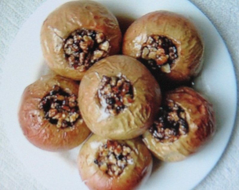 Scoateti cotorul de la mere, maruntiti miezul de nunca si puneti-l intr-o tigaie la foc sa se coaca putin. Adaugati mierea de albine in nuca si amestecati. Umpleti merele cu aceasta compozitie dupa care le puneti intr-o tava si dati la cuptor la 150-180°C timp de 30 minute, pana cand merele sunt coapte. Se lasa putin sa se raceasca dupa care se servesc.