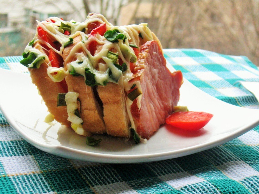 Intr-un vas/tava asezam hartie de copt (cu dimensiuni mai mari, astfel incat sa putem acoperi continutul), asezam feliile de paine, iar printre acestea cascavalul, kaizerul/sunca si ardeiul gras taiat rondele.