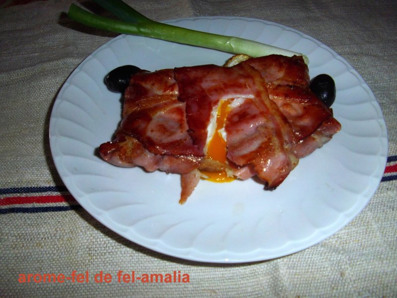 Felia de paine o decupezi in mijloc si o asezi pe 6 felii de bacon usor suprapuse.