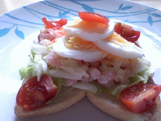 Felia de paine se poate praji pentru cine doreste.Peste ea se adauga cele 2 linguri salata coleslaw, crevetii, oul fiert tare si taiat felii si la sfarsit rosia.