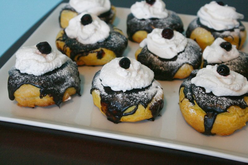 Choux-urile racite le glazuram cu putina ciocolata si dam la frigider 5 minute.Apoi punem frisca intr-un pos si facem un mot zdravan pe choux-uri.Presaram zahar pudra (prin sita) si decoram cu fructe congelate (sau bilute de ciocolata). Au aspectul putin diferit dar gustul e nemaipomenit! Va plac?