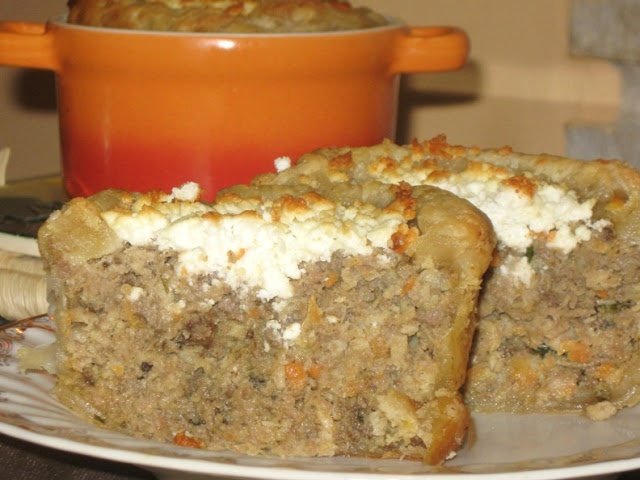 Ungem o forma de ceramica(sau orice alta forma care merge la cuptor) cu unt si o tapetam cu aluat de foietaj apoi punem carnea
