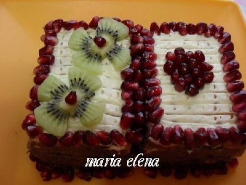 incepem cu pregatirea cafelei pt insiropat la care adaugam 1 plic zahar vanilat si cele 3 lingurite de zahar, apoi o lasam sa se raceasca. Continuam cu prepararea cremei din mascarpone. Se amesteca bine 2 linguri de mascarpone cu 1 plic zahar de vanilie si 1 lingura de zahar pudra. Urmeaza montarea mini-tortuletelor: pe un platou asezam cate o bucata de wafe, o insiropam usor, intindem un strat de crema de cacao, punem o alta bucata de wafe, o insiropam, o ungem cu creama de cacao, apoi asezam a treia bucata de wafe peste care intindem un strat de crema din mascarpone. Cu furculita trasam linii in lungimea si latimea mini-tortuletului, apoi dupa imaginatie decoram cu perlute de rodii si cu felii de kiwi.