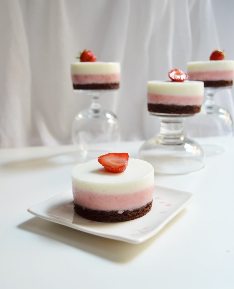 4. Repartizeaza in fiecare forma cate 2 linguri de crema, apoi pune cate o capsunica intreaga in mijlocul fiecareia si introdu in frigider pentru 10 minute.