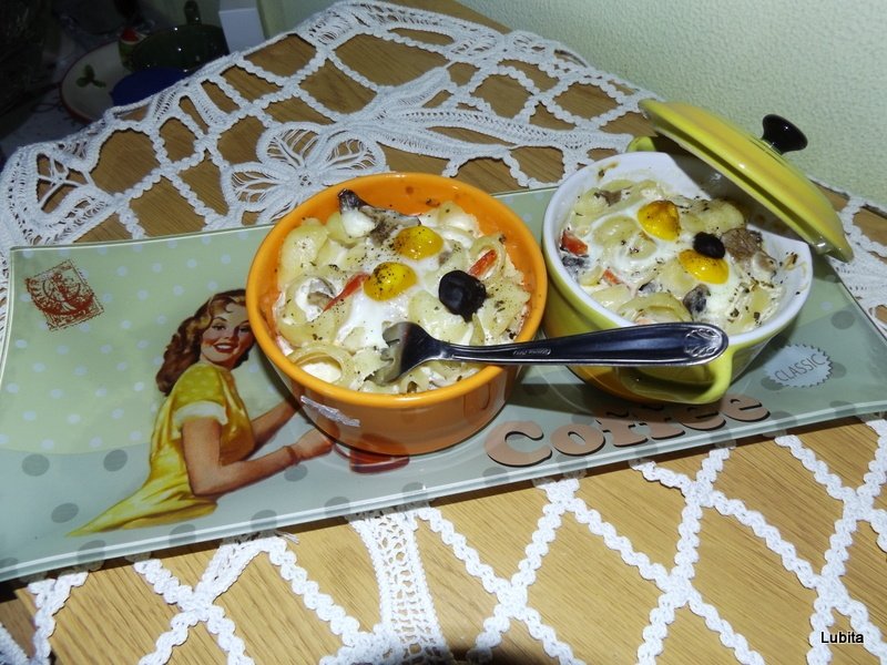 Branza pasata cu furculita se amesteca cu iaurt, apoi cu pastele fierte si scurse, se adauga ardeiul si ciupercile. Se condimenteaza cu sare si piper, apoi se imparte in minicocote sau rimekin. Deasupra se sparg cate 2-3 oua, se condimenteaza cu sare si piper,apoi se lasa la cuptor 15-20 minute.