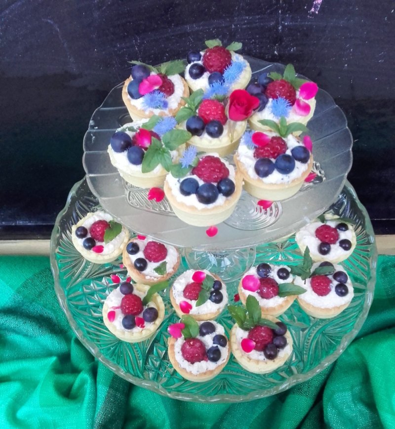 Se orneaza minitartele cu fructe de padure, frunzulite de menta si flori, eu am folosit boboci de albastrele si petale de trandafiri pitici.