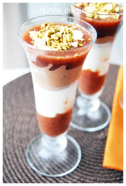 La inceput un strat de piure de prune, apoi unul de iaurt, unul de ciocolata. Terminati cu prune si putin iaurt. Presarati deasupra fistic tocat grosier. Dati la frigider pentru cel putin o ora.