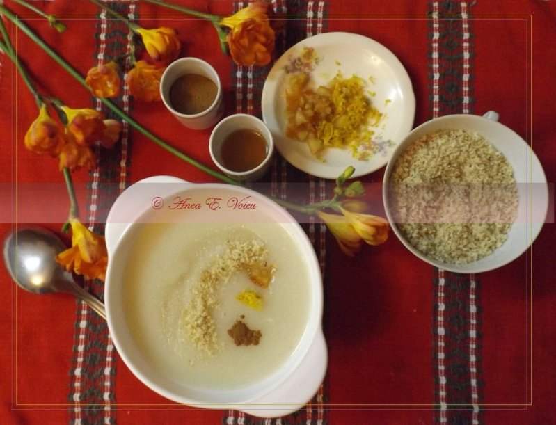 Se servesc calzi, decorand fiecare dupa gustul sau. Eu pun la un castronel: un varf de cutit de coaja rasa de lamaie, 2 linguri rase de zahar, un varf de cutit de scortisoara, o lingurita de rom si 2 linguri rase de nuca macinata. Putem adauga si putina coaja de portocala (din cea tinuta in zahar la borcan peste iarna).