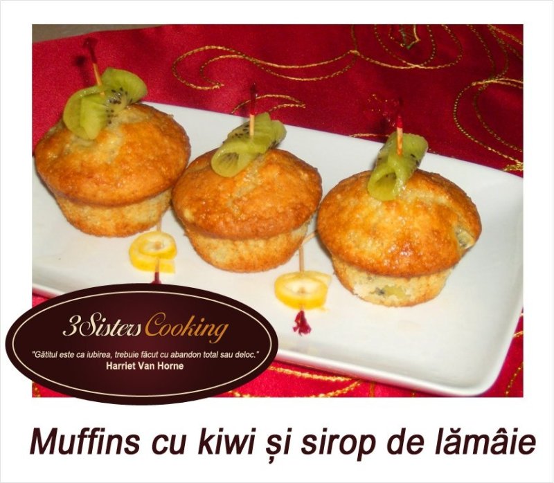 2. Amestecati untul cu oua si lapte. Adaugati la ingredientele uscate impreuna cu kiwi taiat bucatele mici. Omogenizati cu grija pana se leaga intreaga compozitie. Puneti cu ajutorul unei lingurite aluatul in fiecare forma de muffins. Dati la cuptor prntru 25-30 de minute.