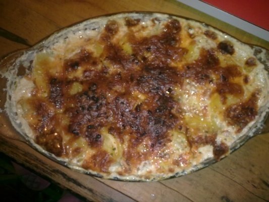 Intr-o tava se aseaza un rand de cartofi, apoi amestecul de carne, peste care se aseaza ultimul rand de cartofi. Pe deasupra se rade cascaval, iar apoi se toarne pasta de tomate diluata cu apa. Se baga la cuptor