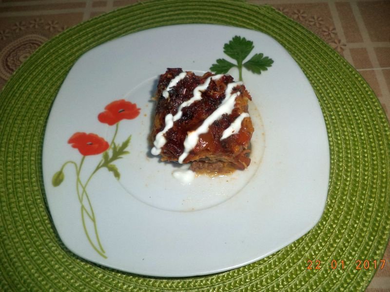 Pregatim dovleceii. Eu am avut dovleceii la congelator rasi si doar i-am pus la scurs. Incingem o tigaie cu putin ulei si punem carnea sa se rumeneasca usor. Asezonam cu sare si piper. Cand se schimba carnea la culoare, adaugam prazul rondele si lasam la calit, apoi adaugam ciupercile si usturoiul feliat. Dupa ce se calesc cateva minute, adaugam vinul. Dupa ce se evapora vinul, adaugam patrunjelul si amestecam, apoi punem lecio. Presaram oregano si potrivim gustul de sare si piper. Adaugam semintele de dovleac si mai tinem 2-3 minute pe foc, amestecand continuu. Luam tigaie de pe foc si lasam compozitia sa se racoreasca, apoi punem un ou si omogenizam. Ungem o tava cu putin unt si asezam un strat generos de dovlecei rasi, apoi punem compozitia de carne, o nivelam si asezam restul de dovlecei. Sosul il pregatim astfel: tocam ceapa si o punem la calit. Adaugam lecio, potrivim gustul de sare si piper si lasam cateva minute pe foc.Turnam sosul peste ultimul strat de dovlecei, presaram busuioc si dam la cuptor pentru circa 30-40 de minute. Servim cu iaurt. Pofta buna!