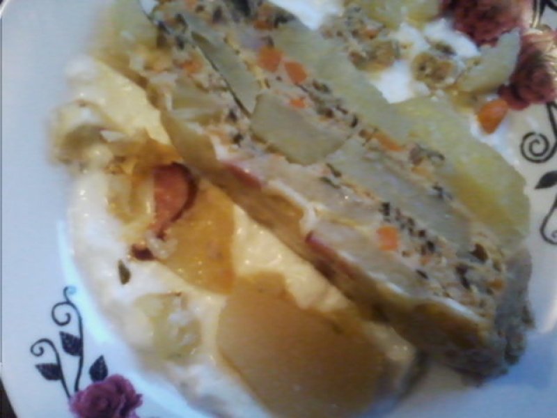 Intr-o forma de yena se pune un strat de cartofi, apoi unul din amestecul de carne, inca unul de cartofi, apoi iar carne, si la sfarsit cartofi. Turnam cateva linguri de supa de cartofi si stropim cu ulei. Peste cartofi formam un gratar din cascaval si jambon/sunca de pui si dam la cuptor.