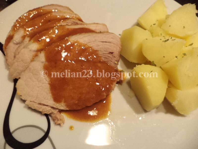 Taiati carnea si serviti cu sosul deasupra, langa cartofi natur si daca va place o lingura de mustar cu boabe intregi.
