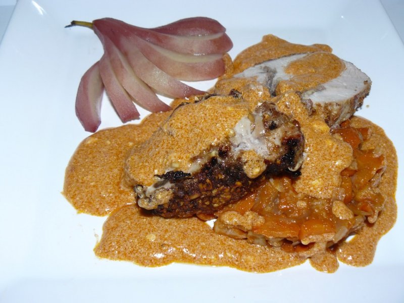 Cu un cutit cu lama subtire si foarte bine ascutit, taiem bucatile pe lungime si facem niste tunele in care sa putem pune umplutura de prune.Condimentam cu sare si piper, inchidem capetele cu scobitori si rulam bine si strans muschiul intr-o folie transparenta in care am presarat inainte alunele maruntite.