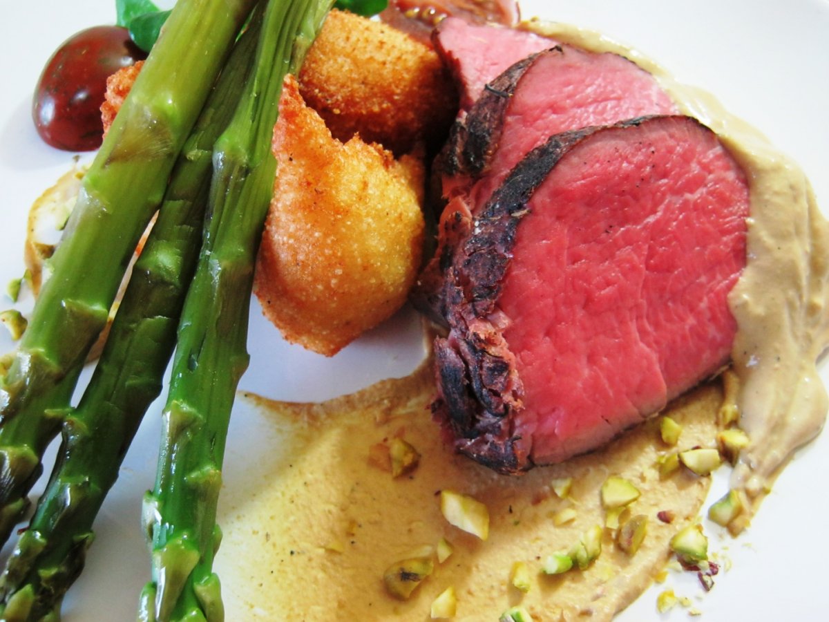 Timp in care va puteti ocupa de garnitura preferata. Eu am ales fire de sparanghel blansate, mousse foie gras cu cogniac, galuscute "mii de gaurele" si fistic maruntit.