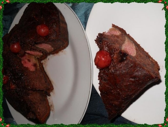 Dam la cuptorul incalzit pana trece testul cu scobitoarea. Lasam sa se raceasca in tava, adaugam ciocolata topita cu untul. Eu am adaugat si niste visine din compot.