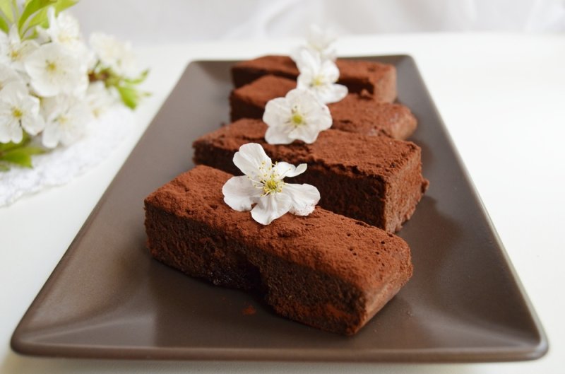5. Dupa ce te asiguri ca blatul e copt, scoti tava si lasi prajitura sa se raceasca complet (preferabil de pe o zi pe alta), apoi tai capetele, o portionezi in bucati de 9 x 4 cm si o pudrezi cu cacao.
