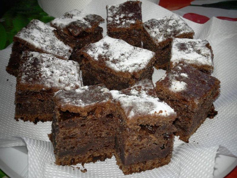 Amestecam faina cu bicarbonatul de sodiu si cacaua si le adaugam in compozitia lichida, amestecand usor cu mixerul pana la omogenizare. Ciocolata o rupem bucatele mici si o punem in umplutura. Turnam compozitia rezultata intr-o tava tapetata cu hartie de copt si dam la cuptor pentru cca. 50 minute sau facem testul cu scobitoarea.