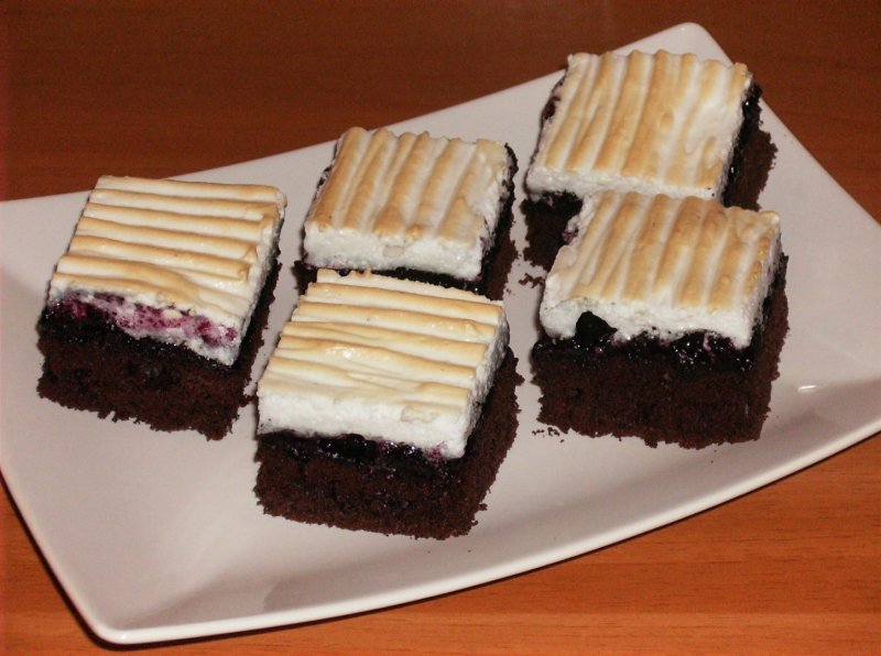 Turnăm compoziţia într-o tavă de prăjitură tapetată cu hârtie pentru copt. Punem tava în cuptorul preîncălzit. Timp de coacere la foc potrivit 15 minute. Facem proba cu scobitoarea, blatul trebuie sa fie coaptă cât mai bine. Dacă aluatul din interior este lipicios pe scobitoare, mai lăsaţi tava pentru 5 minute la cuptor, focul puţin mai mic.