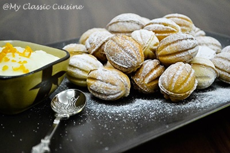 Din acest aluat se formeaza bilute de aceeasi dimensiune. Presa de nuci se unge cu putin ulei si se pune pe flacara de la aragaz pana se incinge. Se pune apoi cate o biluta de aluat in fiecare forma, se inchide presa si se coace pe flacara aproximativ 2 minute pe fiecare parte.