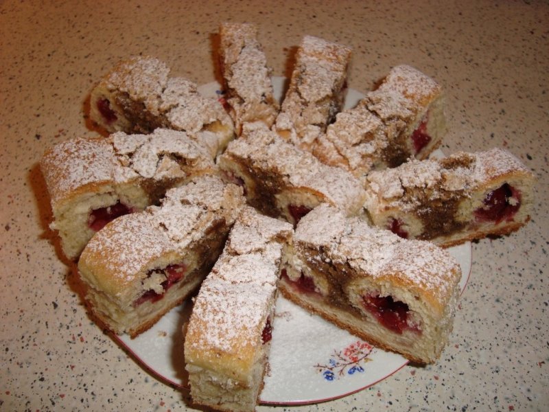 Se intinde cate o turta si pe marginea aluatului se pun visinile, apoi se ruleaza si in miljoc se pune crema.