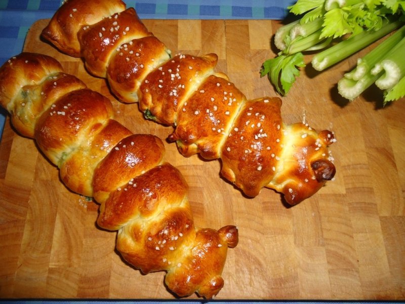 Pe o foaie de copt , pentru a nu se lipii de blatul de lucru se desface aluatul de croissant .Fiecare bucata de croissant se taie in 2. Se ia in palma si se pune o lingurita din umplutura de spanac cu branza.Se ruleaza spre interior,se aduc marginile in centru . Se lasa o bucatica de 2cm , se unge cu ou batut si se aseaza in tava in care formam omida.Se pun bilute ,cat vrem de mare omida.Se unge cu ou batut, se pudreaza cu sare mare si se da la cuptorul incins din clipa in care ne apucam de ansamblarea omidutei.Se coace 10 minute la 200 de grade.