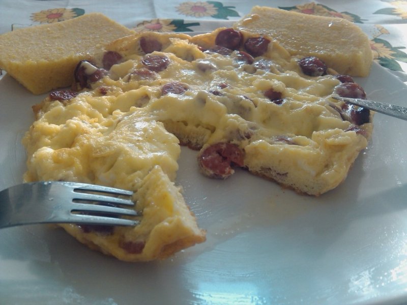 Am pus la călit cârnaţii, fără ai lăsa să se ardă. Separat am batut bine 3 ouă, adăugând brânza de burduf tăiată bucăţi. Am pus amestecul de ouă peste cârnaţi, am pus capac şi am lăsat câteva minute, până a fost gata.