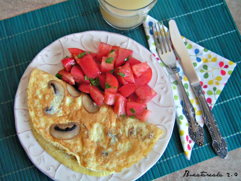 Pentru ca am mancat aceasta omleta cu o salata de rosii simpla, dar cu gust, am inceput cu aceasta, ca sa aiba timp sa stea putin la rece. Am taiat cuburi o rosie, am adaugat putin patrunjel verde tocat, sare, piper si ulei de masline extravirgin. Mergea si un fir fraged de ceapa verde, dar nu am avut la indemana. Se amesteca bine toate si se da la frigider pana in momentul servirii.