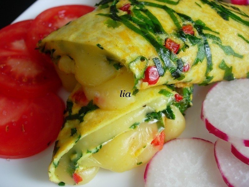 Punem untul la topit intr-o tigaie, adaugam ardeii si-I calim putin, adaugam leurda, amestecam si turnam imedeiat deasupra ouale battue. Asezonam, lasam la prajit, intoarcem ompleta sip e cealalta parte, adaugam cascavalul, oprim focul si rulam omleta.