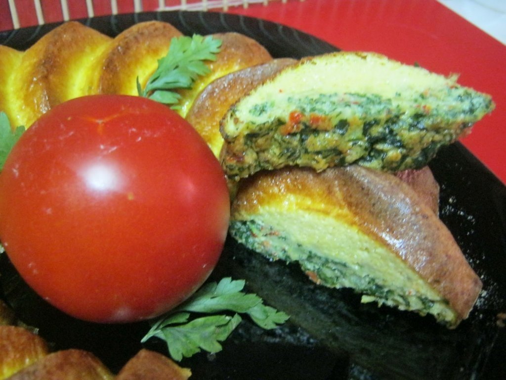 Ungem o forma de silicon cu putin unt si presaram cu faina, apoi rasturnam compozitia omletei in forma si o dam la cuptorul dinainte incalzit 10-15 minute la 180 de grade.